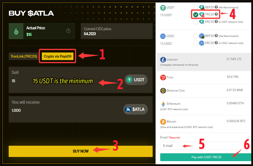 STEP 2:  Log in to the "Dashboard," select "Crypto via Payid19" to pay with USDT or other cryptocurrencies, and purchase $ATLA, 15 USDT is the minimum ( If you have a TronLink wallet, you can log in and pay directly through your wallet ).