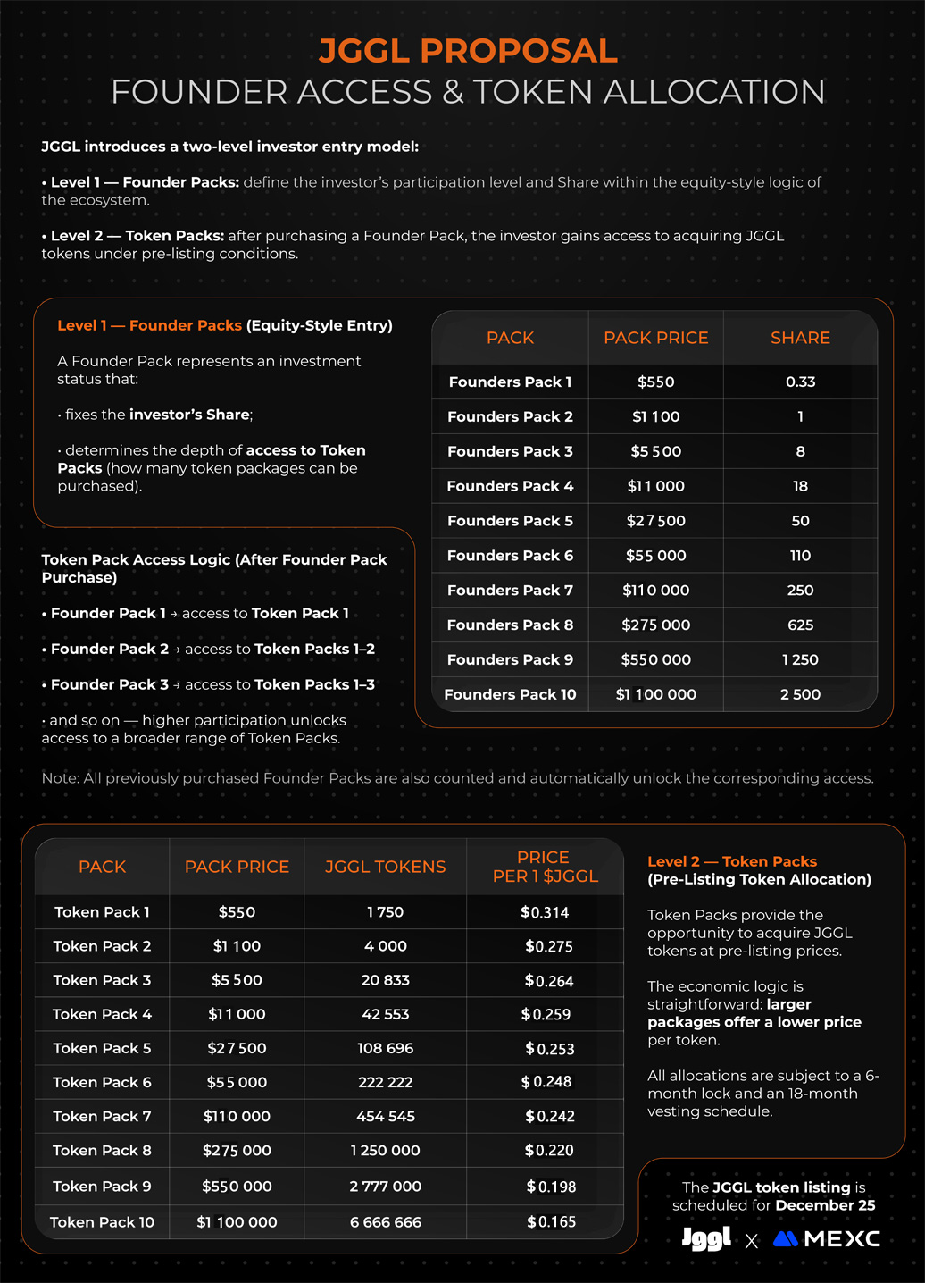 You can upgrade your Founders Pack to a higher tier by paying only the difference. Upgrading gives you access to a larger number of shares. You buy a founders pack and you will have the possibility to buy a TOKEN pack…! JGGL packs , now!, can only be bought after having bought a founder’s pack… ! You don‘t get coins with the shares. You only get the possibility to purchase coins in addition to your shares.Now only Founders can purchase JGGL tokens at the private sale price!
